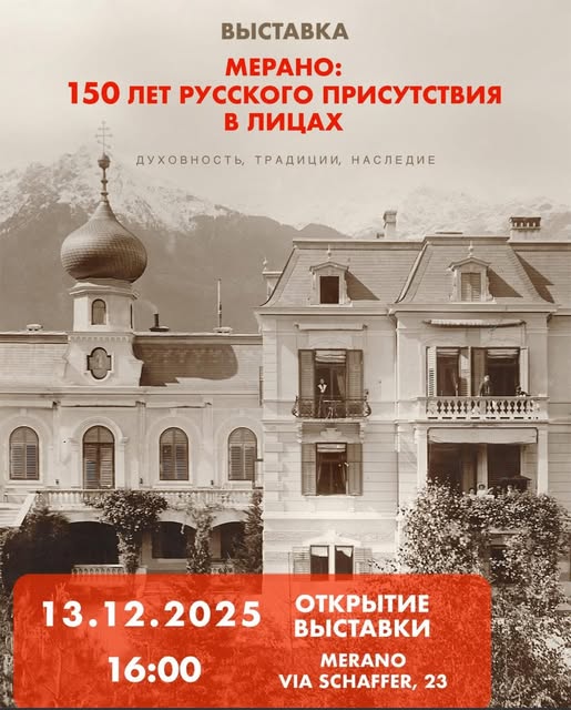 Am 13. Dezember 2025 wird in der Villa Borodina in Meran eine Ausstellung eröffnet, die dem 150. Jahrestag der Gründung des Russischen Komitees und dem Beginn der orthodoxen Gottesdienste in Meran gewidmet ist – Die Ausstellung wird von der orthodoxen Gemeinde des hl. Nikolaus in Meran, dem Russischen Zentrum N. I. Borodina und dem Kulturverein