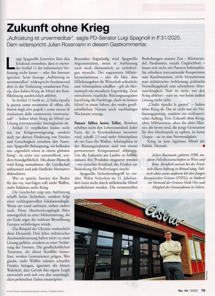 “Aufrüstung ist unvermeidbar“ sagte Pd-Senator Luigi Spagnolli; dem widerspricht Julian Rossmann, Vorstandsmitglied der Südtiroler Grünen, in einem Gastkommentar der „FF“ –
